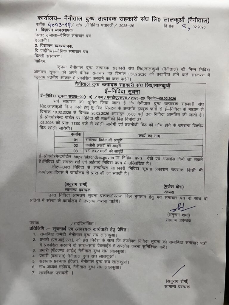 नैनीताल दुग्ध उत्पादक सहकारी संघ लि०, लालकुआँ द्वारा निम्न कार्यों/आपूर्ति हेतु निविदा 1.बायोमास ब्रिकेट की आपूर्ति 2.जलौनी लकड़ी की आपूर्ति 3.दही टब/बाल्टी की आपूर्ति